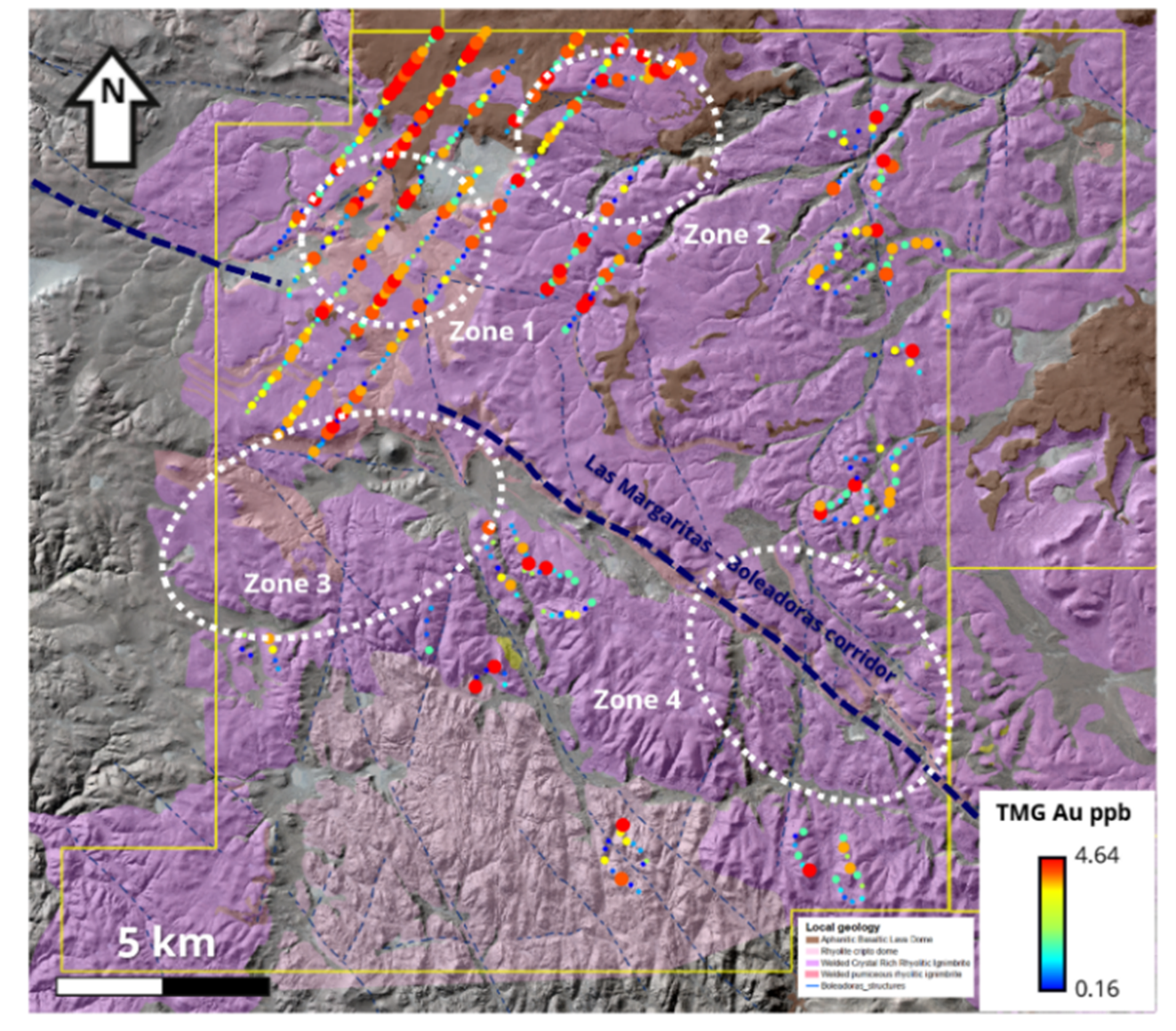 Based on 2023 fieldwork, Newmont has identified a 10 by 8 kilometre priority target area, corresponding with previously identified zones 1, 2 and 3 along the Margaritas-Boleadoras Corridor (Figure 2). Assay results from 2023 drainage sediment and rock-chip samples show that anomalous precious metals (Au, Ag) and pathfinder elements (As, Sb, Hg, Tl, Li, Ba and Se) are associated with silica alteration, host fault zones, sinter structures and subtle hyperspectral responses that are indicative of deeper hydrothermal activity and gold mineralization at the Cerro Negro mine (Table 1). Based on the recent field work, Newmont plans further follow-up exploration activities for 2024.