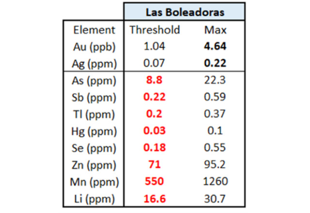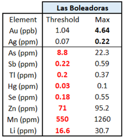 Table 1: Geochemical maximum and statistical threshold values for precious metal and pathfinder elements from drainage sediment BLEG samples at the Boleadora Project.
