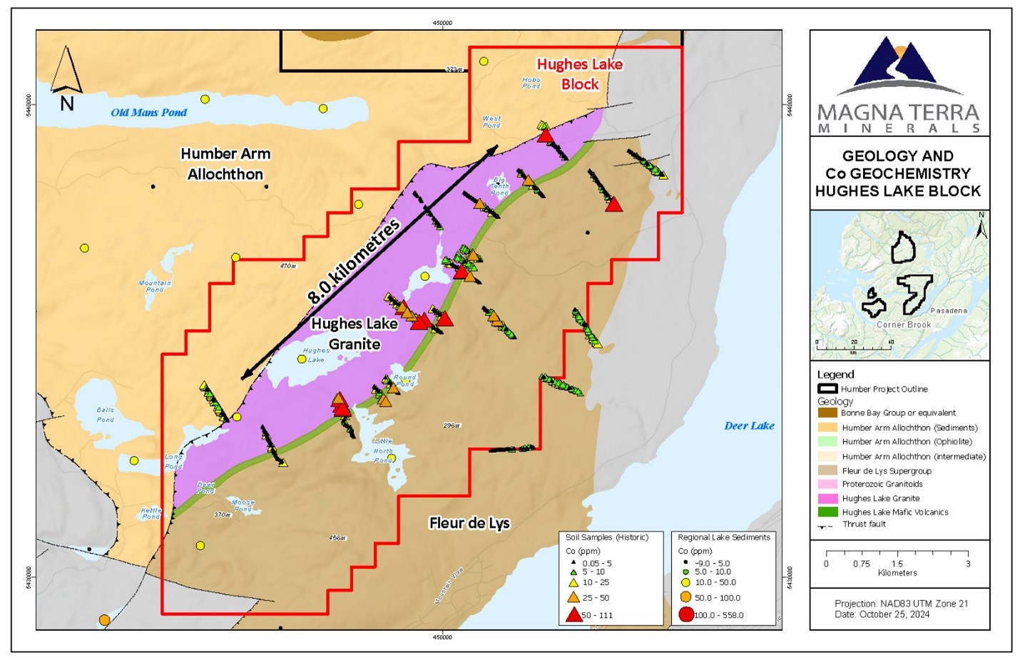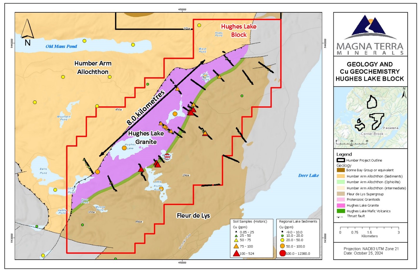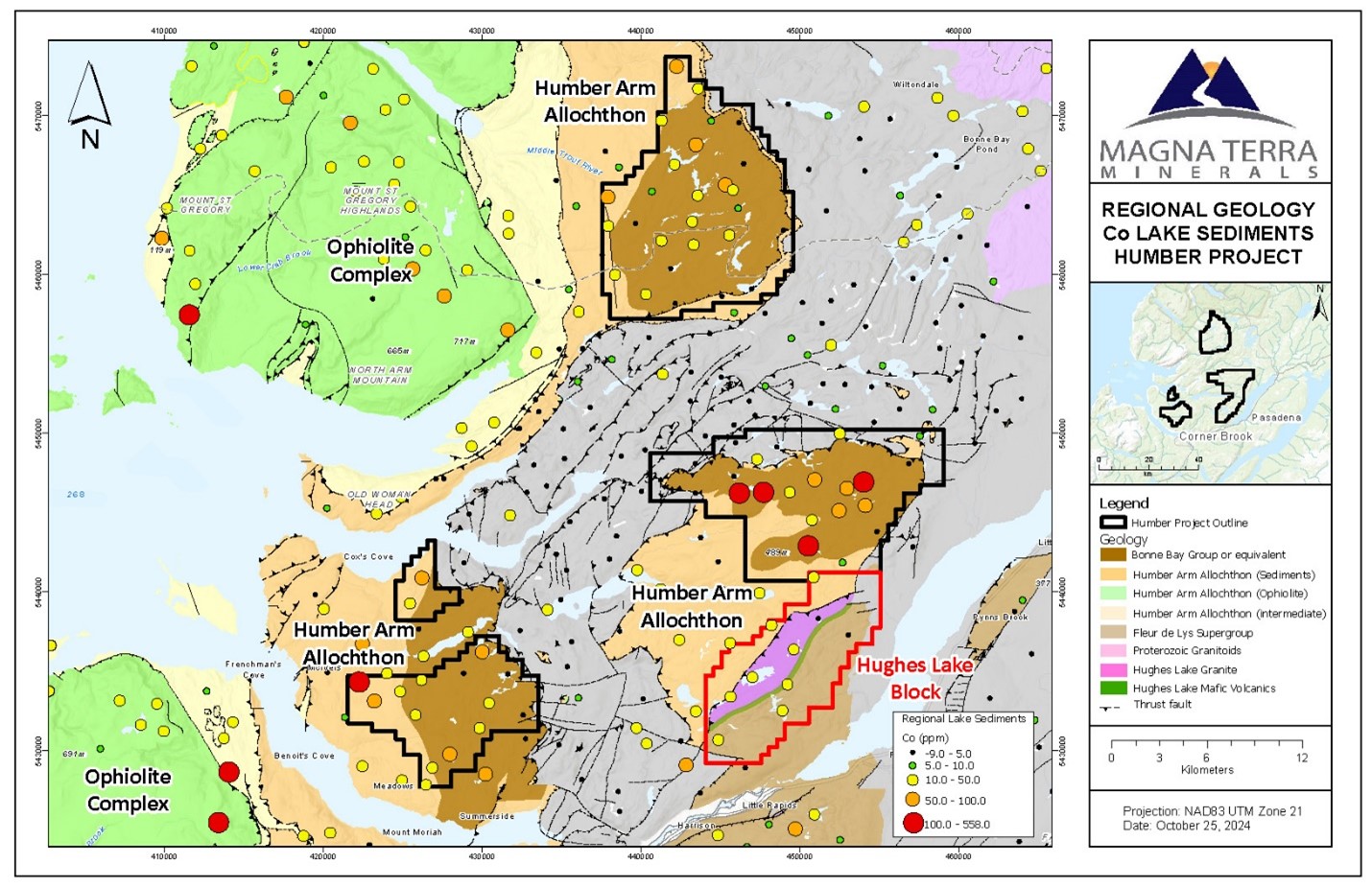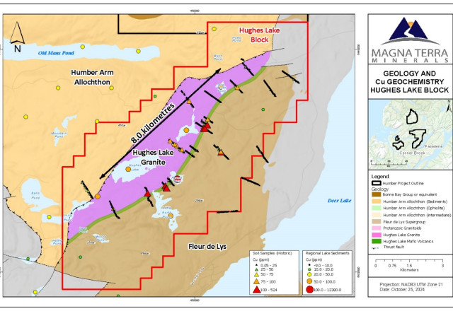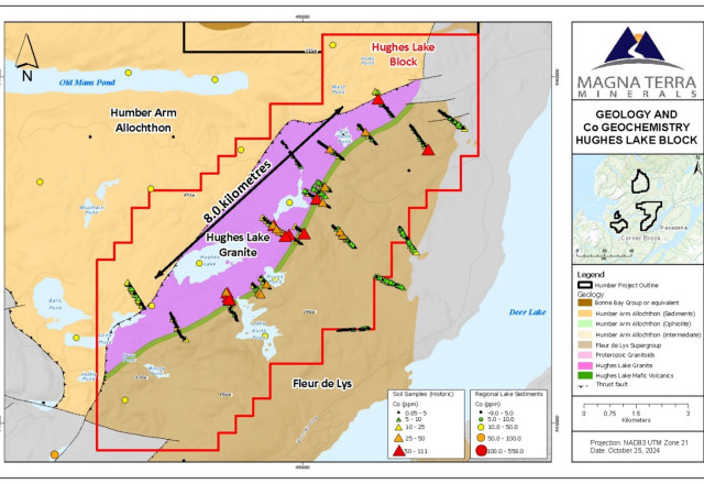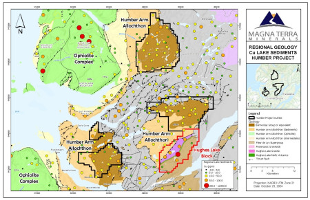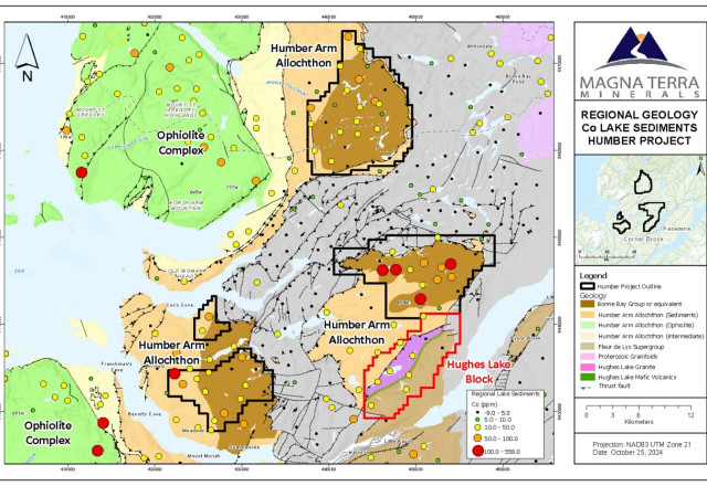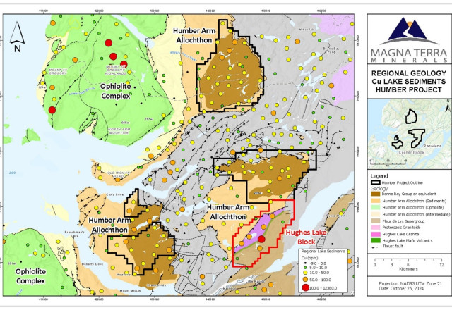 TORONTO, October 29, 2024 (Newswire.com) - Magna Terra Minerals Inc. (the "Company" or "Magna Terra") (TSXV:MTT) is pleased to announce that it has acquired via staking two additional mineral licences comprising 7,550 hectares (the "Hughes Lake Block") expanding the Humber Copper-Cobalt Project (the "Humber Project" or the "Project") located in western Newfoundland by 23%. The Humber Project is an exploration project focused on critical minerals and metals and now comprises 1,627 claims in 12 mineral licences covering a total area of 40,675 hectares (Figure 1). The Project is underlain by rocks of the sedimentary Humber Arm Allochthon and adjacent plutonic and volcanic Hughes Lake Complex, which are host to coincident anomalous copper (Cu), cobalt (Co), lead (Pb), silver (Ag), molybdenum (Mo), gold (Au), arsenic (As), and antimony (Sb) lake sediment values (Figures 1 and 2).