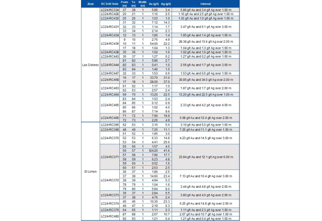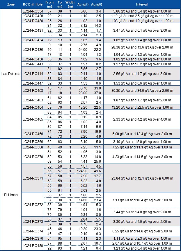 The main objective of the 2024 drilling program at the Las Dolores area is to test for extensions of shallow, high-grade zones outside the current MRE limits. Drill holes LC24-RC436 intersected 28.38 g/t Au and 13.6 g/t Ag over 2.00m (ETW) at 9.8m below surface, and LC24-RC458 intersected 30.85 g/t Au and 34.0 g/t Ag over 2.00m (1.8m ETW) at 11.4m below surface.