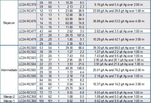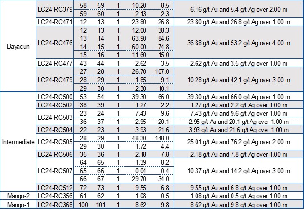 The key objective of this year's drill program at Bayacun is to verify structural continuity and demonstrate extensions of high-grade blocks within the current MRE. Drill hole LC24-RC476, which is the highest grade x thickness interval reported in this press release, intersected 36.88 g/t Au and 53.2 g/t Ag over 4.00m (ETW) at 9.2m below surface. This hole confirms a 10m southwest strike extension of the high-grade mineralization previously encountered in drill hole LC20-220 which intersected 93.30 g/t Au and 61.4 g/t Ag over 0.9m (0.8m ETW) (see press release dated June 15th, 2020).