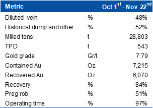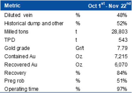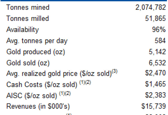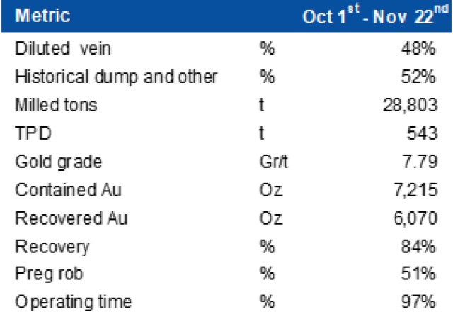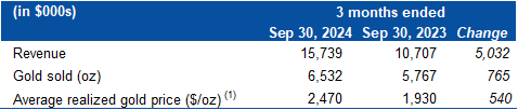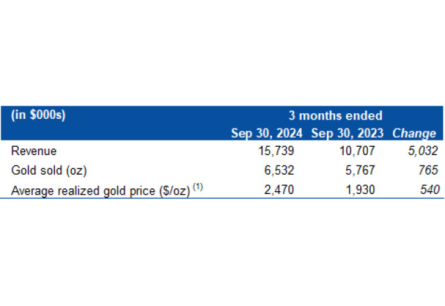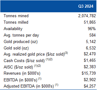 Akiba Leisman, Chief Executive Officer, states that "Q3 2024 production was constrained by a six-month permit delay for the Las Conchitas EIA which arrived at the beginning of the quarter. 6,532 ounces of gold were sold at $2,383/oz AISC, with $607 per ounce of this AISC related to the 1.3 million tonnes of accelerated pre-strip which needed to be removed outside of our original bulk sample permit area. Also related to the permit delay, the remainder of the increase in AISC was due to lower head grades (4.2 g/t gold) as only 14% of the mill feed derived from diluted vein material instead of the approximately 50% blend that is normally available. Consistent high-grade mineralization was only available in September after the 1.3 million tonnes of waste was removed. Despite this, the Company generated $4.3 million in Adjusted EBITDA and positive net income. Through the first 52 days (57%) of Q4 2024, production is back to normal, with head grades up over 85%, recoveries up over 10% and realized gold prices up over 10% relative to Q3 2024 (see Table 1 below). Therefore, there will be a commensurate increase in production, reduction in AISC and increase in profitability for Q4 2024.
