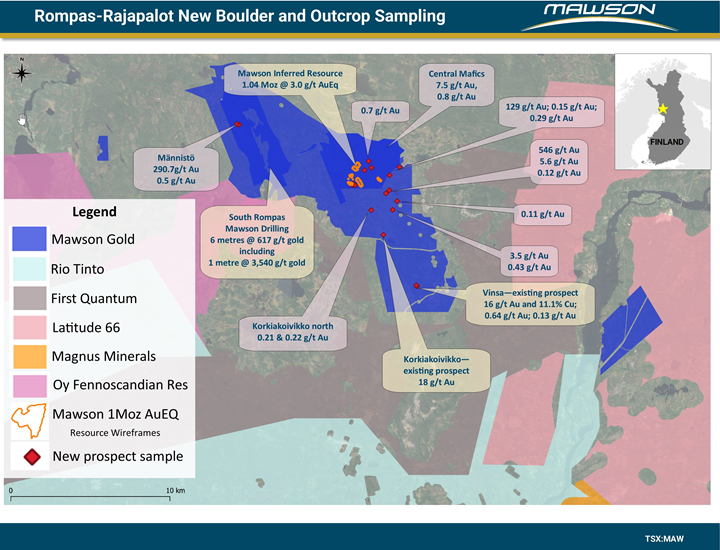Mawson Discovers 8 New Prospects with High Grade Boulders up to 546 g/t gold over 20 kms in Finland