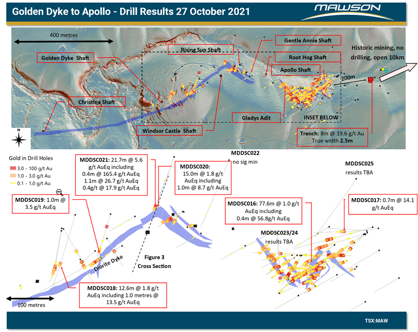 - Golden Dyke is located 600 metres west of the Apollo Mine. The Golden Dyke workings consisted of 20 individual stopes over 200 metres strike, down to 180 metres vertical depth (Figure 2). It is estimated a total of 15,000 ounces @ 12.6 g/t Au were extracted during the late 1800s to the early 1900s. Free gold recoveries were reported to be around 50% due to metallurgical complications (at the time) with stibnite.
