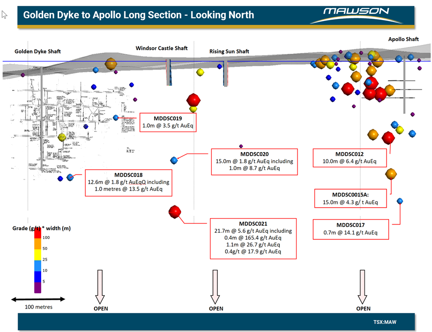 Figure 2: Longitudinal ("Long") Section of the Golden Dyke to Apollo Mine Area highlighting Mawson drillholes MDDSC0016 and MDDSC0022 reported here.