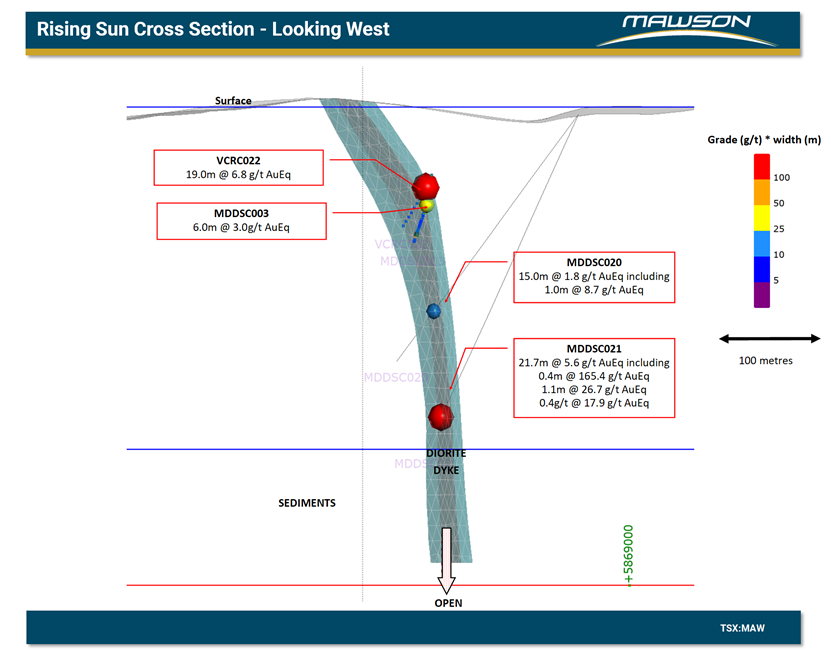 Figure 3: Cross Section of the Rising Sun Mine showing Mawson drillholes MDDSC020 and MDDSC021 reported here
