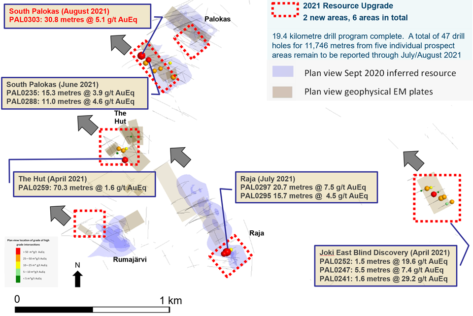 Mr. Hudson, Chairman and CEO, states "This is a great result. South Palokas has delivered very strongly this season, with high-grade mineralization extended by 280 metres down plunge and remains open. PAL0303 (30.8 metres @ 3.9 g/t Au, 1,403 ppm Co, 5.1 g/t AuEq) is the deepest hole drilled at South Palokas and is demonstrative of the significant resource expansion opportunities that remain at Rajapalot. The mineralized body at South Palokas has now been drilled 650 metres down plunge. Drilling this year has demonstrated significant growth to the four current resource areas and has also added two further resource areas. We look forward to releasing remaining drill hole results and announcing the next resource upgrade in August."