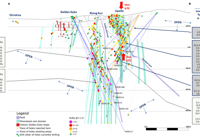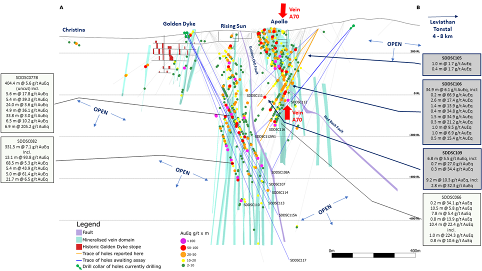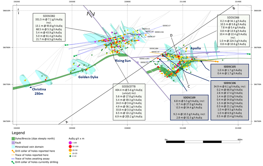 SDDSC106 was drilled east to west through into the Apollo Deep area and successfully traversed 6 high-grade vein sets over a 200 m interval. SDDSC106 contains eight intervals >15 g/t Au (up to 59.9 g/t Au) and eight intervals of >5 % Sb (up to 34.5% Sb) . This hole confirms the mineral system is increasing in grade at depth (Figure 3) as it does across the Sunday Creek field. This observation is considered extremely promising. Several drillholes to report (SDDSC108A, 112W1 and 116) will continue to test the trend of higher grades and thickness at depth at Apollo.