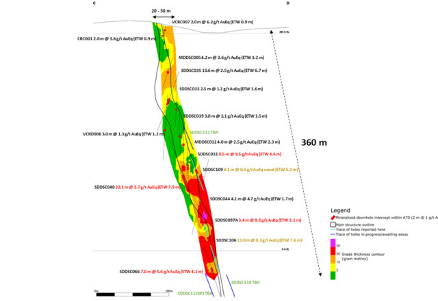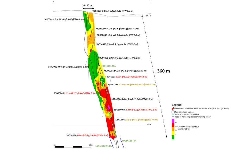 Figure 3: Sunday Creek longitudinal section of the modelled vein set A70 across C-D, looking towards the west-south-west (striking 340 degrees). Showing SDDSC106 and SDDSC109 (light blue trace, orange text) reported here and prior reported drill holes. Raster coloring of wireframe shows grade x true thickness increasing at depth.