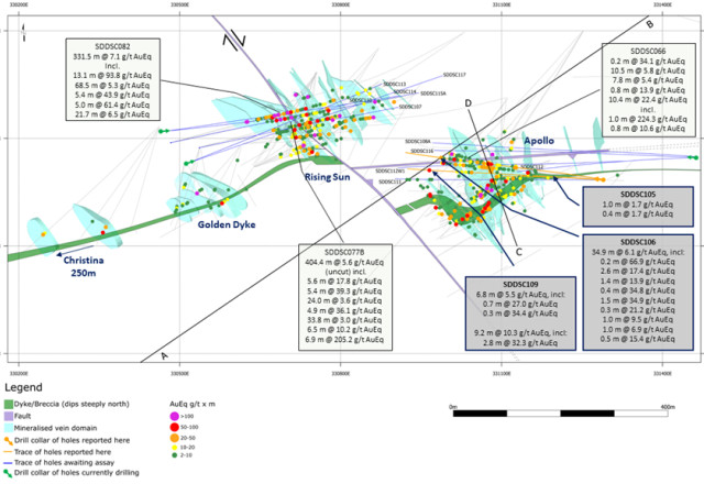 Figure 2: Sunday Creek longitudinal section across A-B in the plane of the dyke breccia/altered sediment host (see Figure 1) looking towards the north (striking 236 degrees) showing mineralized veins sets. Showing SDDSC105, 106 and 109 reported here and prior reported drill holes. Location of Figure 3 (section C-D marked with red arrows).