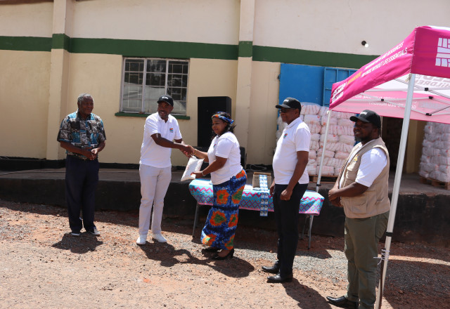 McHenry Makwelero, Country Representative for Feed the Children Malawi, presents a packet of VitaMeal to Honorable Mary Navicha MP, Malawi's Minister of Gender, Children, Disability and Social Welfare, during a symbolic handover ceremony at the VitaMeal Lumbadzi Warehouse, highlighting the launch of emergency food support for children in drought-affected communities in the Lower Shire.