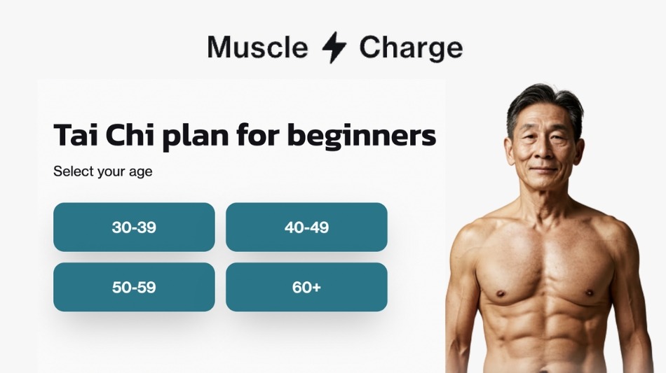 Muscle Charge is a fitness application marketed under the ReverseGroup and Reverse Health ecosystem. According to the official landing page, the program offers what it describes as a "Tai Chi plan for beginners" and asks users to select their age range (30-39, 40-49, 50-59, or 60+) to receive a personalized program.