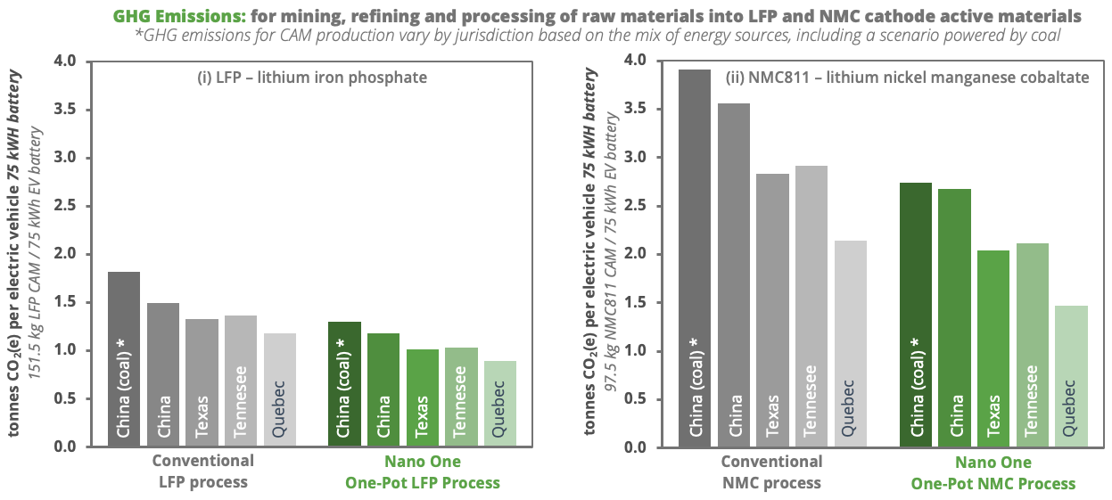 "The third-party LCA report shows that Nano One's innovative One-Pot Process could cut GHG emissions significantly," stated Nano One's CEO, Mr. Dan Blondal, "and does so by reducing complexity and energy intensity, while also decreasing physical footprint and costs. By using sulfate-free input materials, Nano One also mitigates unsustainable wastewater and sodium-sulfate by-products. Engineering studies have also shown that the One-Pot Process uses up to 60% less water than incumbent processes. Collectively, these benefits help solidify the environmental advantages of Nano One's technology, and position the Company with a leading, cost-effective solution to support a cleaner global transition to net-zero."