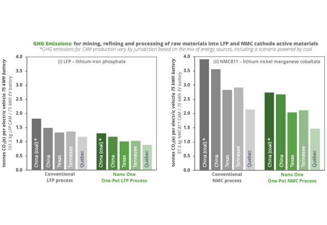 Nano One® Materials Corp. ("Nano One" or the "Company") is a clean technology company with a patented process for the production of lithium-ion battery cathode active materials (CAM). The Company is pleased to report that an independent life cycle assessment (LCA) of its proprietary One-Pot Process shows that greenhouse gas (GHG) emissions could be reduced by up to 60% for the production of nickel-rich NMC811 CAM and up to 50% for LFP CAM.