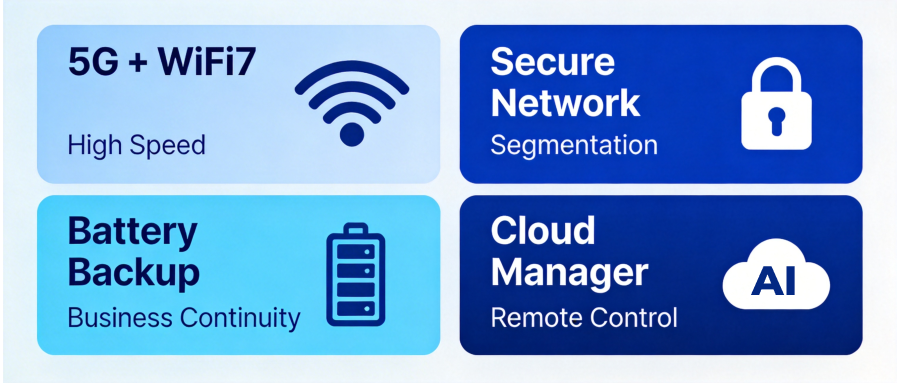 High-performance connectivity: Supports 5G Release 16 and Wi-Fi 7 to maintain stable POS transactions, online orders, and digital services during peak hours