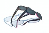 RS Sun 09's thick, angle-cut temples, elongated oval eye shape, and semi translucent acetate create a sporty sleek look for the Roxy girl on the go. The black frame features a hot pink translucent undertone with hot pink dipped temple tips. The tortoise frame is dipped in white. A metal Roxy heart icon is imbedded in the upper temple.