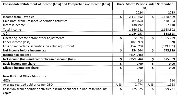 Royalty revenue of $2,117,552 (2023 - $1,628,409) was earned with 614 (2023 - 614) attributable gold equivalent ounces ("GEOs") sold at average price of US$2,474 (2023 - US$1,928) per ounce, up 30% from 2023 and 11% from the previous quarter driven by higher gold prices.