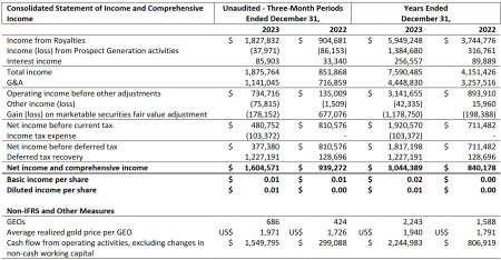 - Royalty Revenue: Royalty revenue of $5,949,248 (2022 - $3,744,776) was earned in 2023 with 2,243 (2022 - 1,588) attributable gold equivalent ounces ("GEOs") sold at average price of US$1,940 (2022 - US$1,791) per ounce, up 59% compared to the same period in 2022.