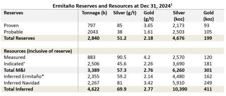Subsequent to the year ended December 31, 2024, First Majestic announced an initial inferred resource on the Navidad vein within the Ermitaño mine complex, adding 249,000 ounces gold and 5.9 million ounces of silver, increasing inferred resources 260% year on year. 1 Reserves and resources for the Ermitaño mine complex at December 31, 2024 are as follows.