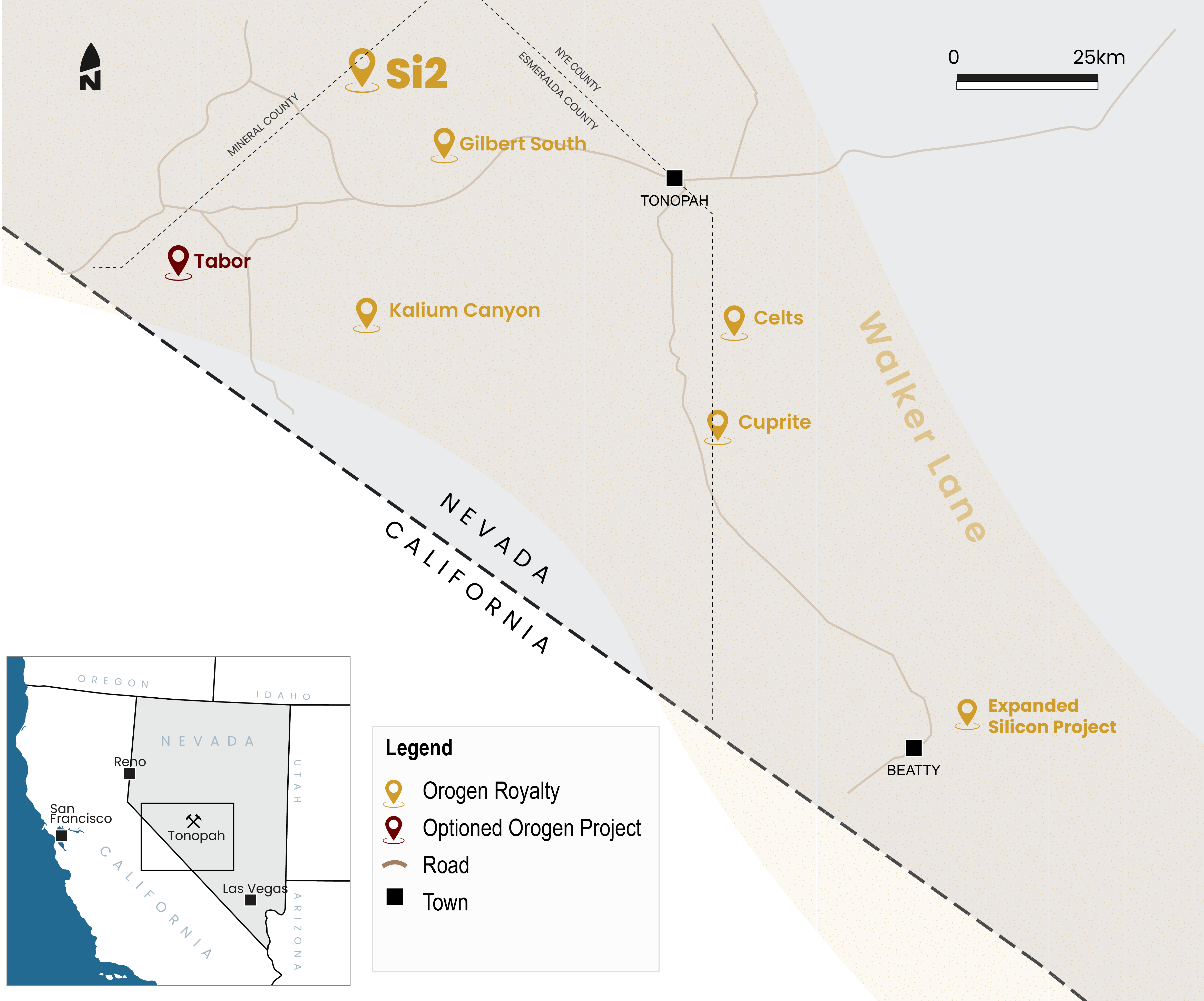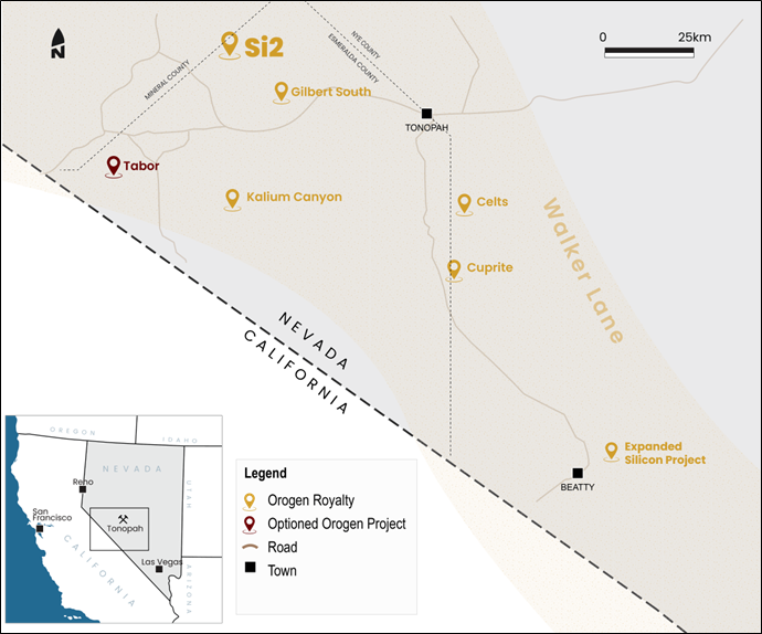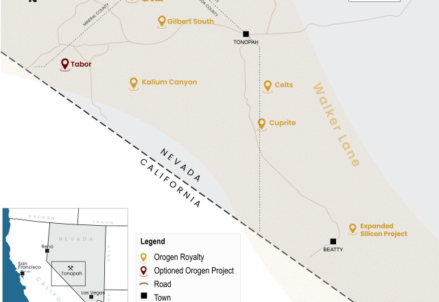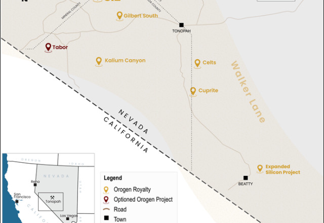 "K2's initial efforts indicate the Si2 gold project shares many similarities with the multi-million ounce Expanded Silicon Project in the Beatty district, where Orogen holds a 1% NSR royalty2," commented Orogen CEO Paddy Nicol. "By purchasing the Project outright, K2 will be able to advance Si2 methodically within the constraints of the challenging equity market for junior exploration companies. We are excited to see K2's exploration team advance another asset in Nevada's prolific Walker Lane Trend."
