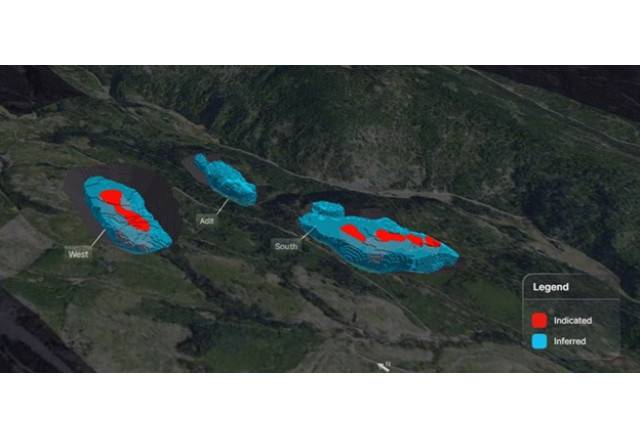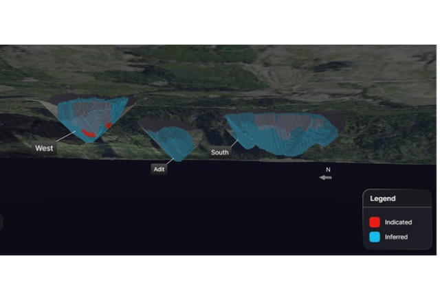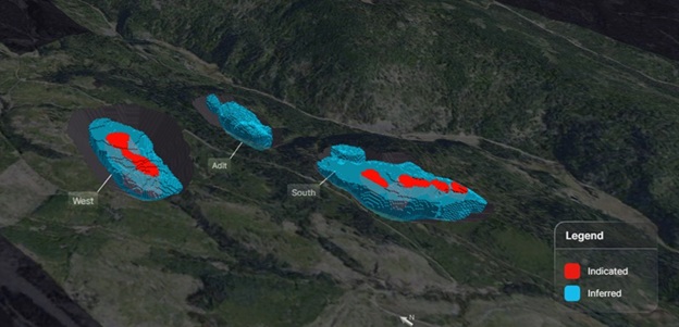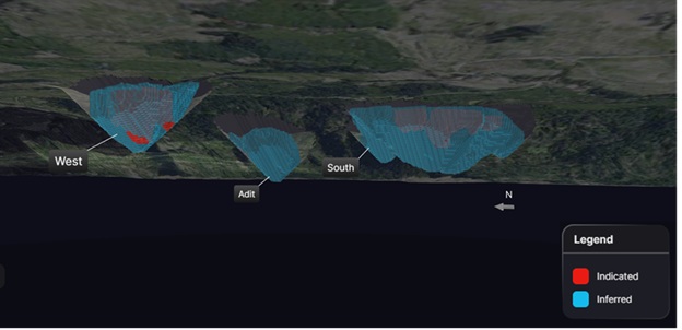 West and Adit deposits host high grade mineralization from surface while South is a larger bulk tonnage deposit over one kilometre in length and underexplored