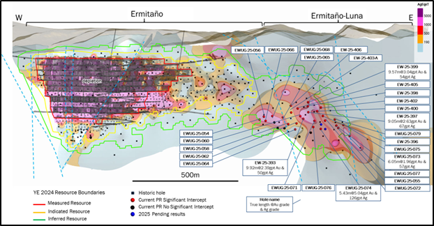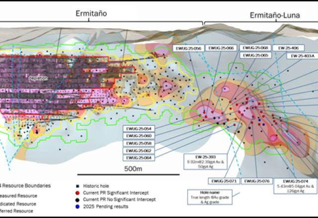 Resource conversion drilling at the Ermitano-Luna area includes hole EWUG-25-074 grading 5.04 g/t gold and 126 g/t silver over 5.4 metres (true width)