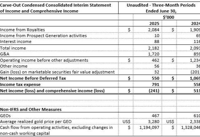 The Company has included certain results in this news release that do not have any standardized meaning prescribed by International Financial Reporting Standards ("IFRS") including, total GEOs sold, average realized gold price per GEO, working capital, and cash flow from operating activities excluding changes in non-cash working capital adjustments. The Company's royalty revenue is converted to a gold equivalent ounce by dividing the royalty revenue received during the period by the average gold price of the period. The Company uses certain non-IFRS financial measures, including working capital, calculated as current assets minus current liabilities, to assess short-term liquidity and operational efficiency. This measure does not have a standardized meaning under IFRS and may not be comparable to similar measures used by other companies. The Company also uses operating cash flows excluding changes in non-cash working capital, calculated by adjusting cash provided by (used in) operating activities to exclude changes in non-cash working capital. This provides insight into cash flows from core operations.