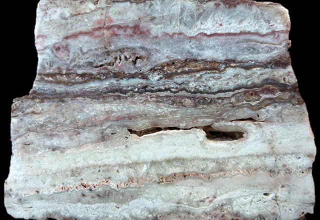 The property is cut by widespread veining with vein widths locally exceeding three metres and returning anomalous precious metal values of up to 2.62 g/t gold and 49.7 g/t silver. The multiple outcropping veins display textures including crustiform-colloform fine-grained quartz and coarse silica after platy calcite typical of low-sulphidation epithermal veins (Photo 1).