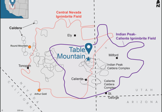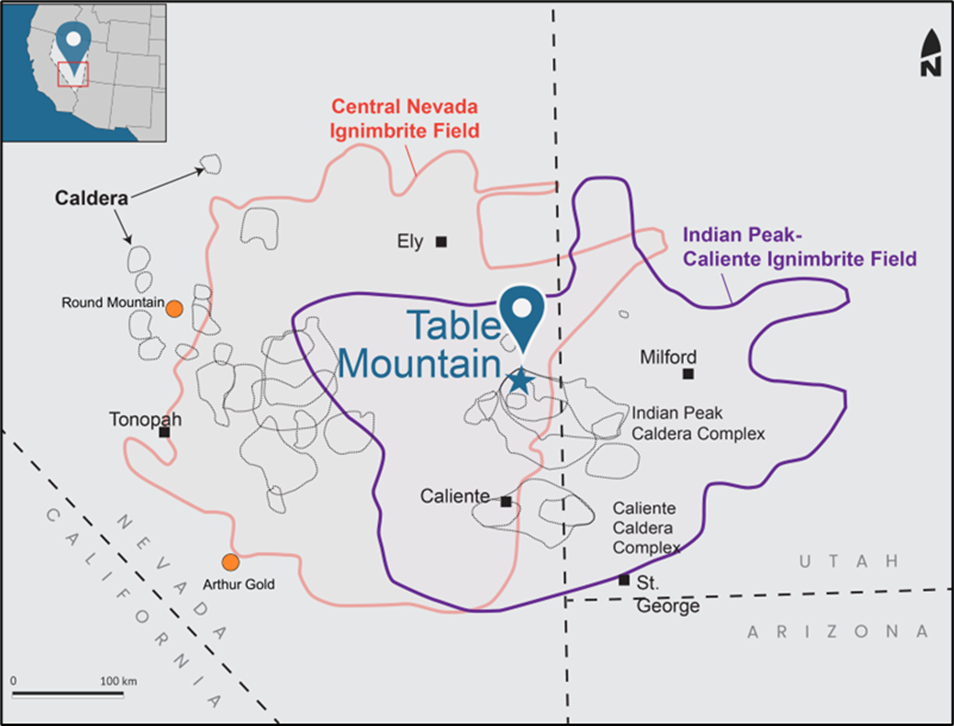 The Table Mountain project consists of 184 lode claims located forty-five kilometres north of the town of Pioche within the Oligo-Miocene Indian Peak Caldera complex (Figure 1) in eastern Nevada. The claims are located on ground managed by the BLM with rough road access.