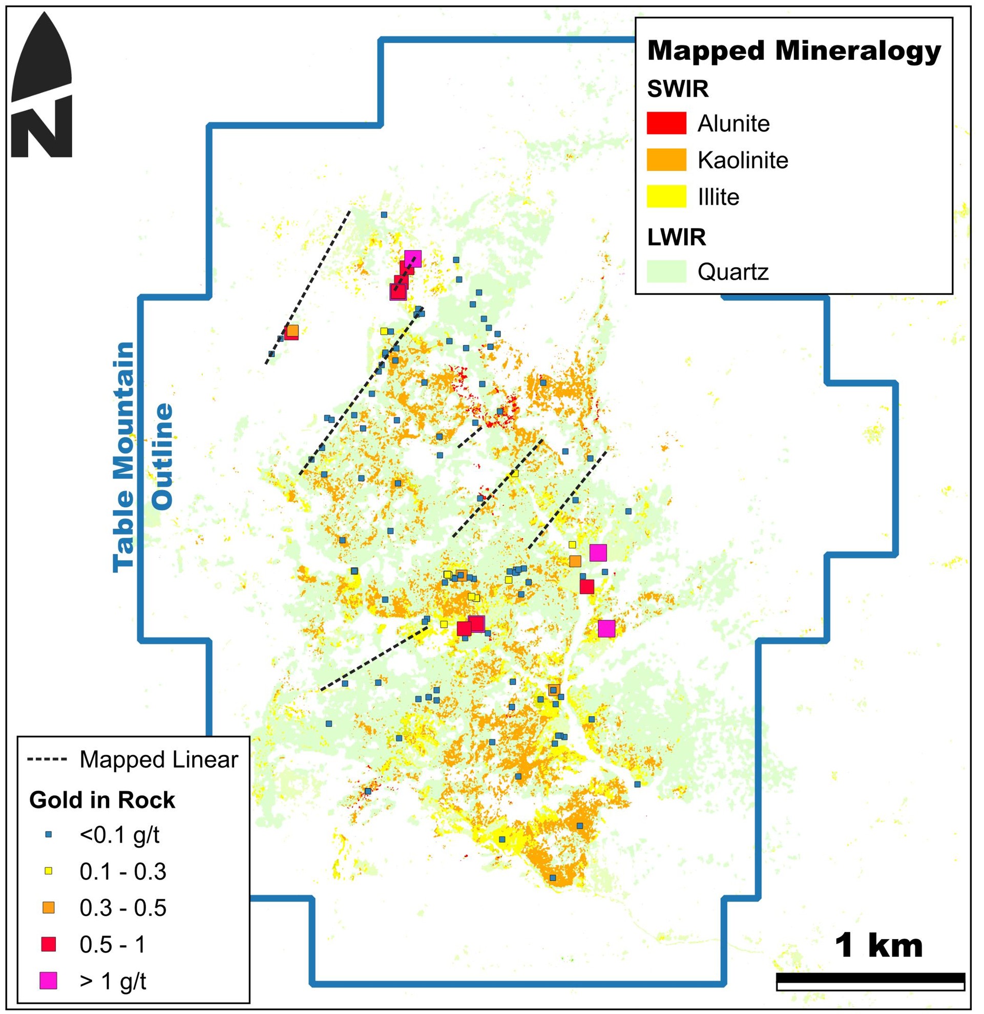 The assay results reported from the Table Mountain property represent first pass reconnaissance samples typically "grab" or "select" in nature. They do not represent the true width or grade of the veins. All rock samples were analyzed by ALS Geochemistry via Au-ICP21 (Au 30g FA ICP-AES Finish), Hg-MS42 and ME-MS61. The samples were processed at ALS Reno and ALS Vancouver. Orogen does not insert any standard, blanks or duplicates during first pass reconnaissance rock sampling.