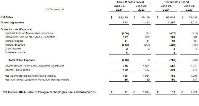 Paragon Technologies, Inc.'s Consolidated Statement of Operations for the three and six months ended June 30, 2024 and 2023 are summarized below. For further detail on our results, shareholders should carefully review our quarterly report, which can be found at www.pgntgroup.com.