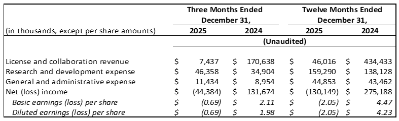License and collaboration revenue of $7.4 million for the fourth quarter of 2025 was comprised of development services we provided during the period under the Takeda Agreement. License and collaboration revenue of $170.6 million for the fourth quarter of 2024 included (i) achievement of a non-refundable $165.0 milestone under the JNJ Agreement, and (ii) development services we provided during the period under the Takeda Agreement.