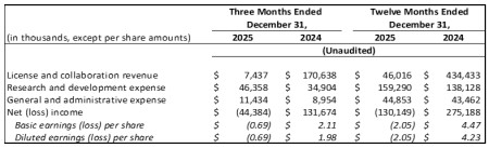 General and Administrative Expenses: Increased by $2.5 million for the three months ended December 31, 2025, from the prior year period primarily due to increases in professional services and personnel-related expenses. The increase of $1.4 million for the full year 2025 as compared to the prior year was primarily due to increases in professional services and personnel-related expenses, partially offset by $4.6 million in one-time advisory and legal fees in 2024 related to the Takeda Agreement.