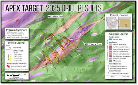 Anomalous gold mineralization was encountered in all 12 holes, including 0.42 g/t Au over 1.35 m in hole 25AP-009 at 382.45 m hole depth.