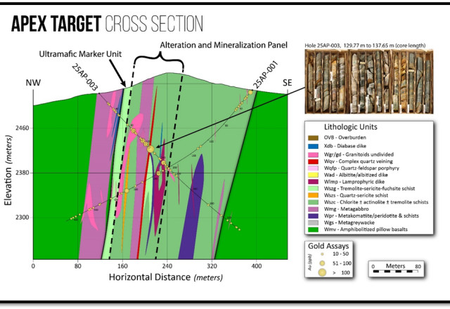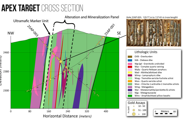 Figure 2. Cross-section illustrating broad mineralization and alteration panel at Apex marked by hydrothermal alteration, gold mineralization, and pathfinder element geochemistry. Upper right photo: Hole 25AP-003 Lower contact of Apex vein zone with oxidized vein salvage containing 0.22 g/t Au and 0.19% Cu over 0.43m core length at 135.74m hole depth. This zone was cut where the strike and dip projection extends from the surface high-grade exposures at Apex, confirming a broad mineralizing shear corridor at Apex with the ability to carry high-grade gold.
