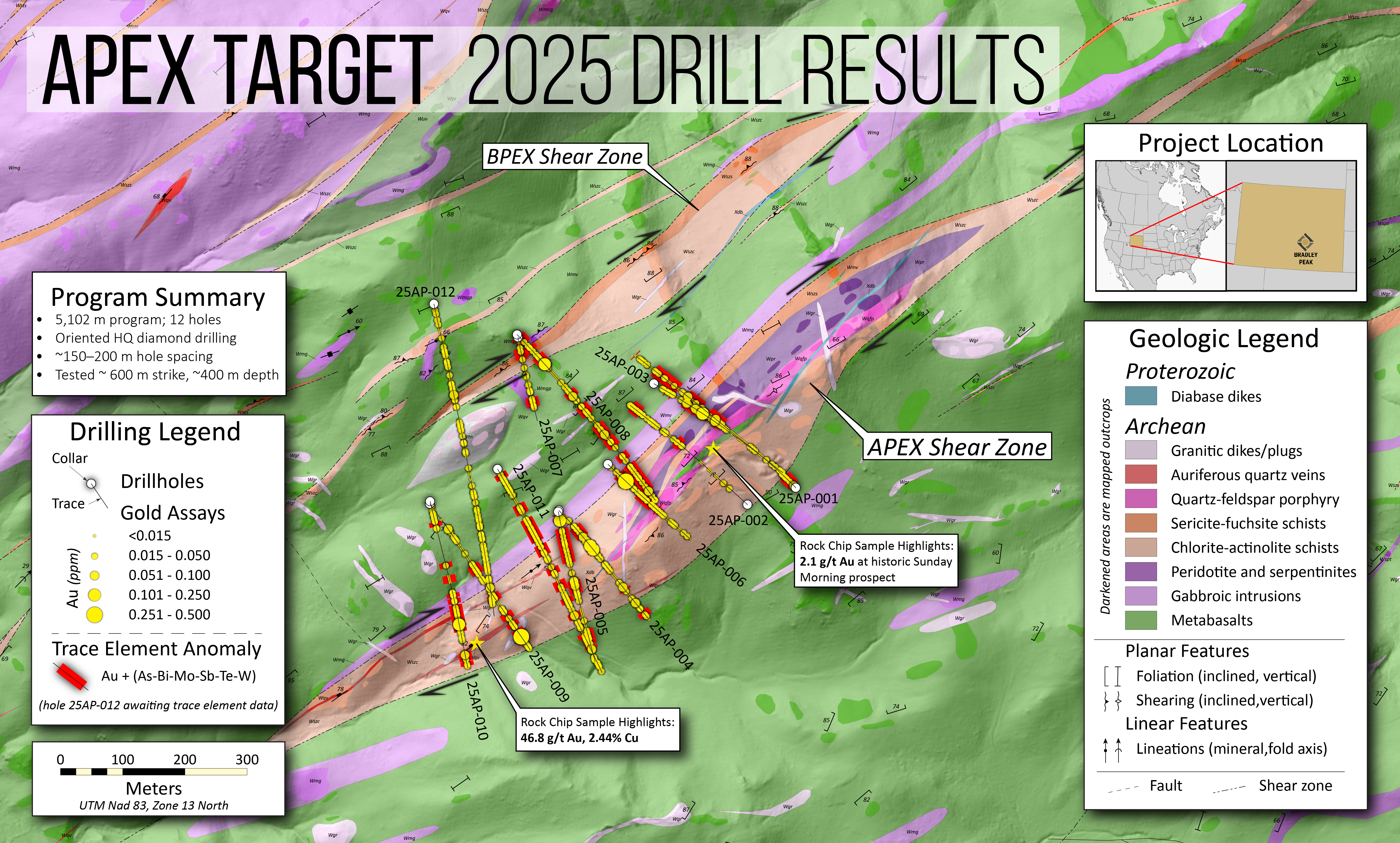 "To intersect consistent gold-bearing alteration and veining across 600 m of strike and 400 m of depth in the first-ever drill program at Apex confirms we're into a large, fertile system and validates our orogenic gold model," said Rob Bergmann, CEO of Relevant Gold. "While individual gold intercepts from this program are modest, they sit within a broad, well‑developed corridor and give us the structural and geochemical framework we need to vector toward higher‑grade zones. Apex remains a top‑tier exploration priority, and the recognition of parallel shears like BPEX underscores the scale potential we continue to see in the Bradley Peak Gold Camp. Together with the upcoming VTEM geophysical results, these data will guide a targeted, follow‑up drill program aimed at testing deeper, structurally favorable positions and additional shears within the broader Bradley Peak trend."