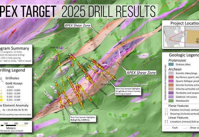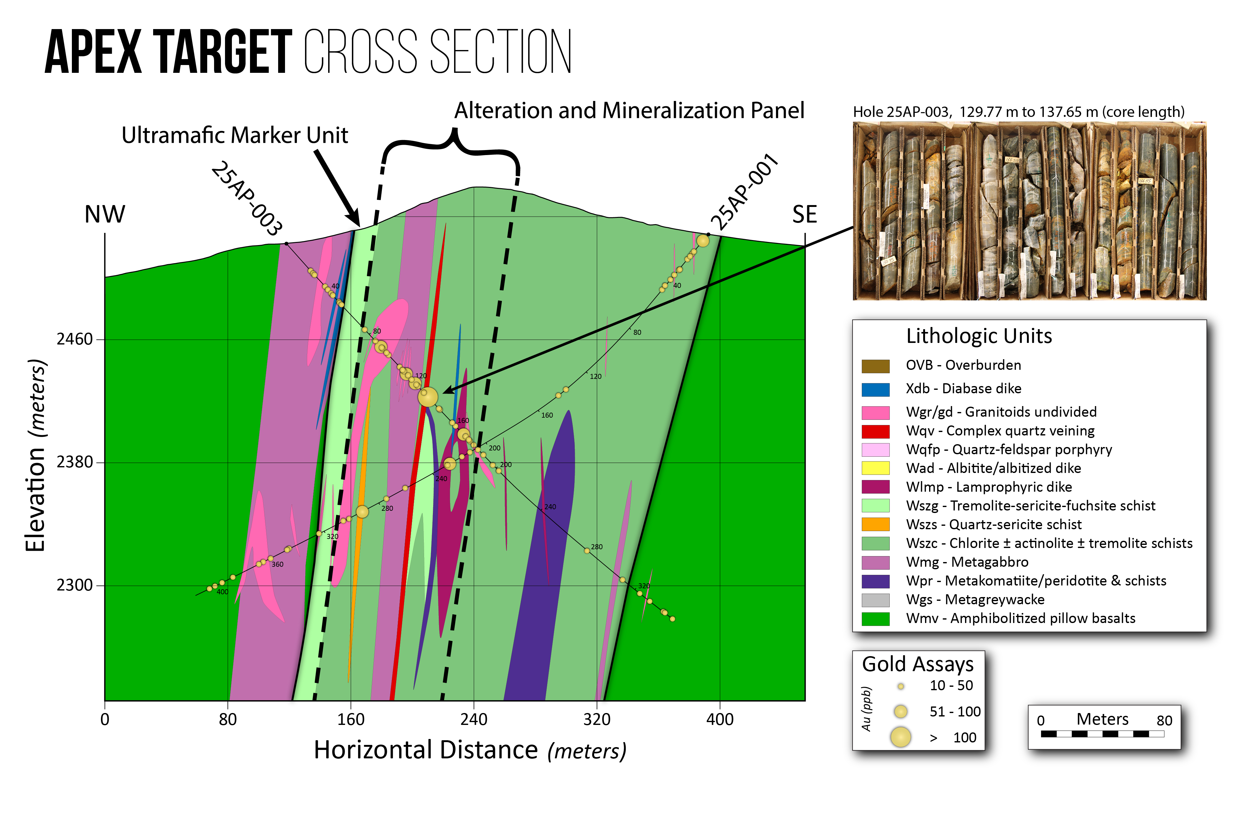 The 2025 program was designed to (1) test the vertical continuation of favorable host rocks and shear structures identified at surface, (2) evaluate the hanging wall and footwall contacts of the Apex shear, along with its overall structural geometry, (3) test the presence and continuity of hydrothermal alteration zoning and, (4) confirm the continuation of quartz-carbonate veining (See June 11, 2025 Press Release). The spacing of drill holes was intentionally broad (150-200m spacing) to evaluate system scale, continuity, and boundaries, and hole orientations were varied to determine dip on the shears.