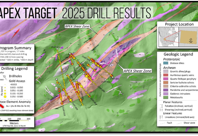 VANCOUVER, British Columbia, January 21, 2026 (Newswire.com) - Relevant Gold Corp. (TSXV:RGC)(OTCQB:RGCCF) (the "Company" or "Relevant Gold") is pleased to report results from its 2025 diamond drill program at the Apex Shear Target, part of the 100%-owned Bradley Peak Gold Camp in the Seminoe Mountains, central Wyoming. The 5,102 metre (m) HQ diamond core drilling program, the first ever completed at Apex, has confirmed the presence of a large, fertile Archean orogenic gold system, such as those in the Canadian Abitibi Belt, characterized by: