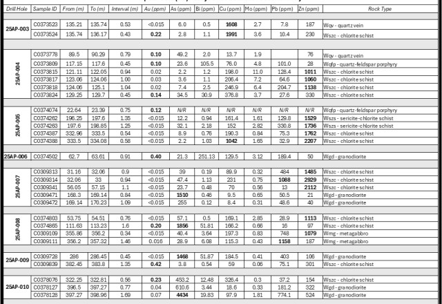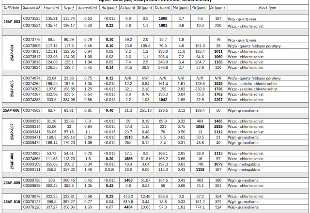 0.20 g/t Au over 1.60 m in hole 25AP‑008 from 111.63 m to 113.23 m.
