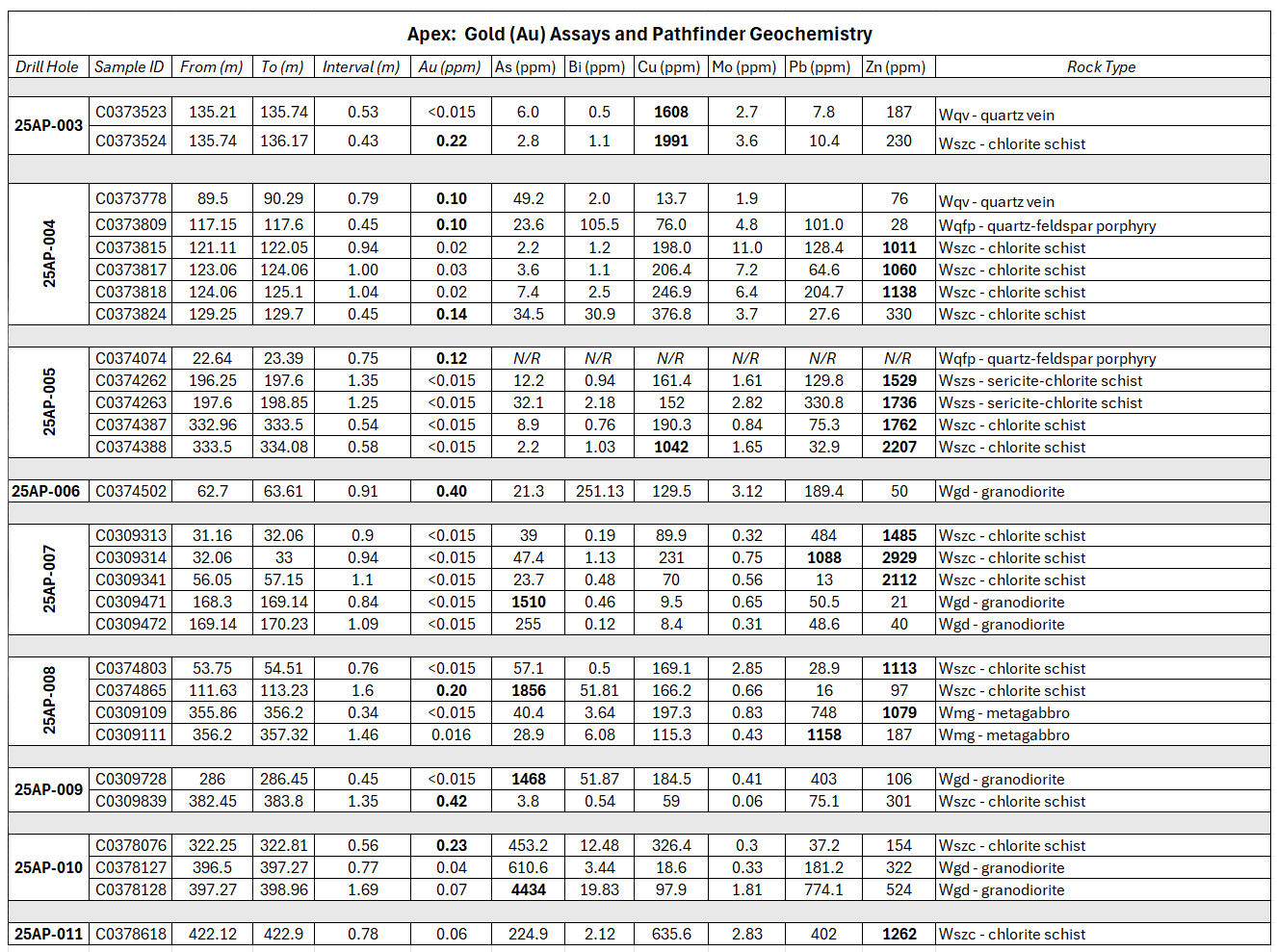 0.22 g/t Au and 0.19% Cu over 0.43 m in hole 25AP‑003 from 135.74 m to 136.17 m, adjacent to a >3 m quartz vein. This zone was cut where the strike and dip projection extends from the surface high-grade exposures, confirming a broad mineralizing shear corridor at Apex with the ability to carry high-grade gold (see Figures 1 and 2).