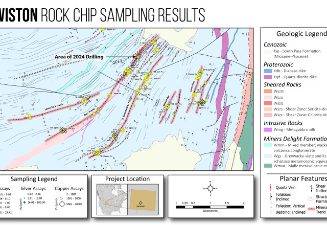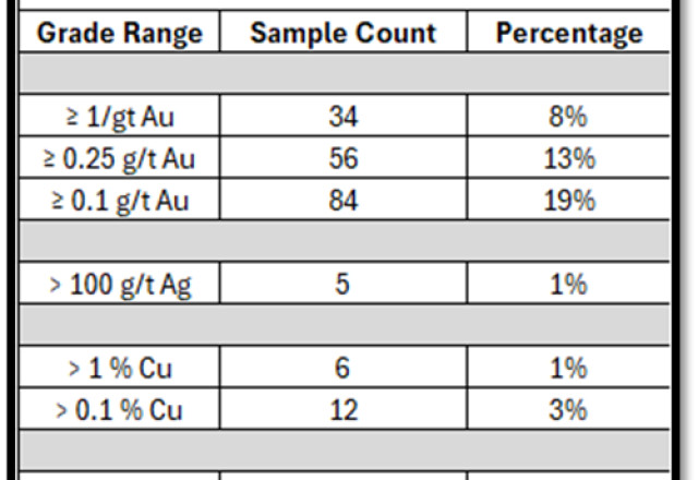 These results confirm widespread shear and vein-hosted gold, silver and base-metal mineralization across multiple parallel shear corridors in the southern Lewiston area. Peak gold assays include 25.4 g/t Au, 16.78 g/t Au, 13.1 g/t Au, 12.3 g/t Au and 10.3 g/t Au. High-grade silver (Ag) samples are highlighted by assays up to 2,203 g/t Ag and 603 g/t Ag; high-grade Copper (Cu) and lead (Pb) values include up to 12.7% Cu, and 6.4% Cu, and 4.3% Pb, accompanied by anomalous (>1,000 ppm) pathfinder elements (As-Bi-W-Zn). All of these results indicate a larger hydrothermal system with orogenic-style mineralization concentrated within distinct structural shear corridors. Gold mineralization supports potential for both low-grade bulk-tonnage and high-grade vein targets within the Lewiston corridor that manifests as: