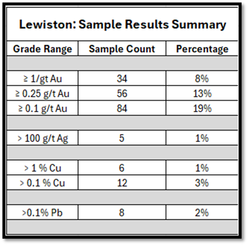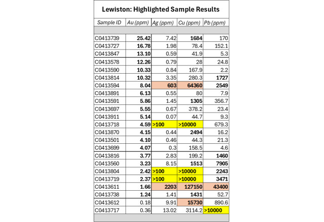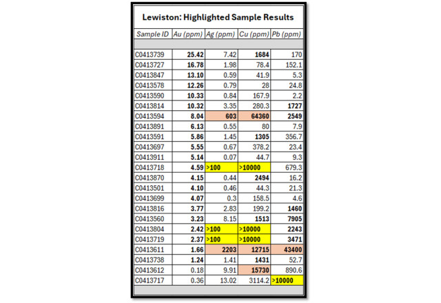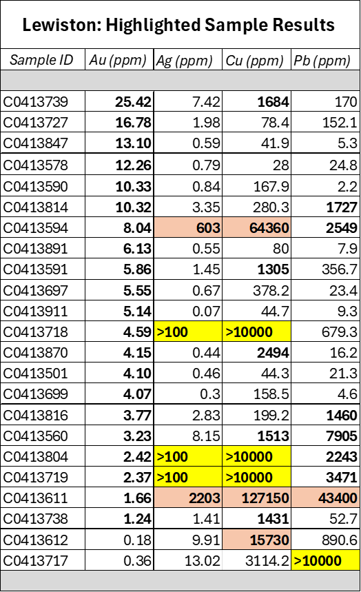 5 rock-chip samples report >100 g/t Ag, and several samples report >1% Cu and >1% Pb, supporting an extensive polymetallic system within the Lewiston shear corridor.