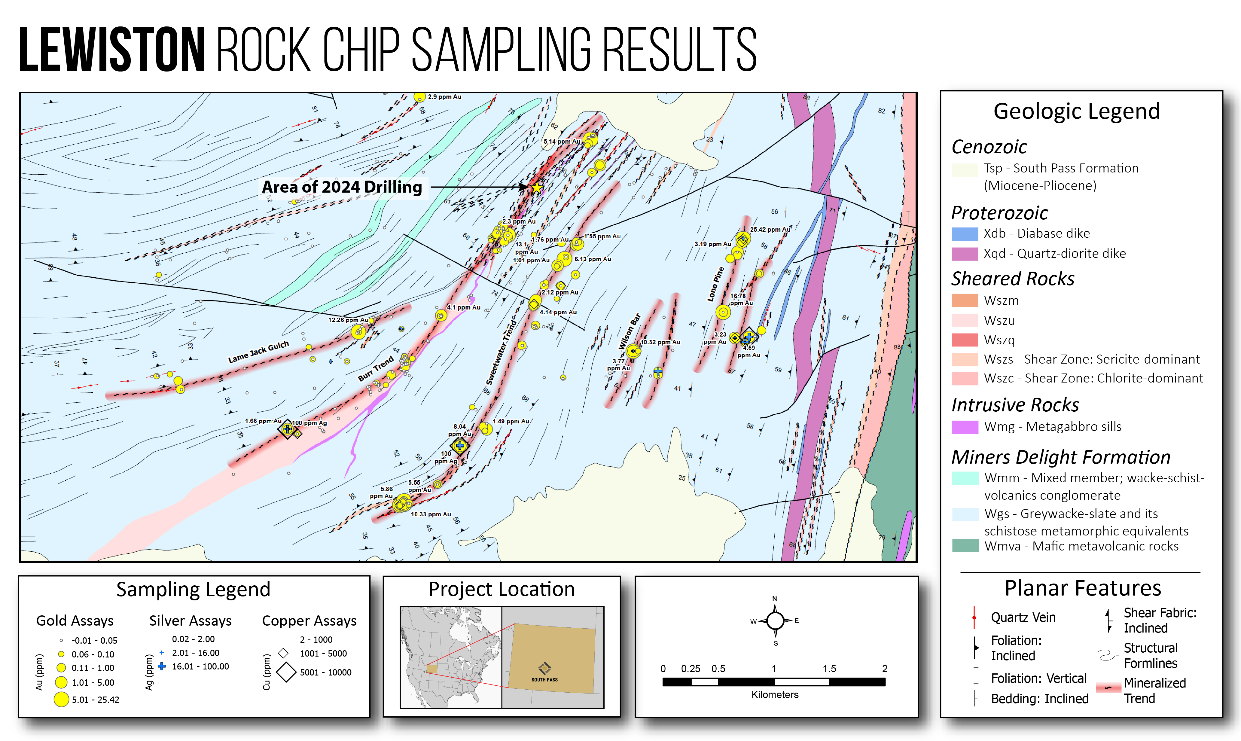 These results demonstrate that the Burr shear trend extends at least 2.5 km southwest of the 2024 drill area and continues to host high-grade gold, silver and copper at surface, significantly increasing the potential strike length and scale of the Lewiston mineralized corridor and its parallel shear zones.