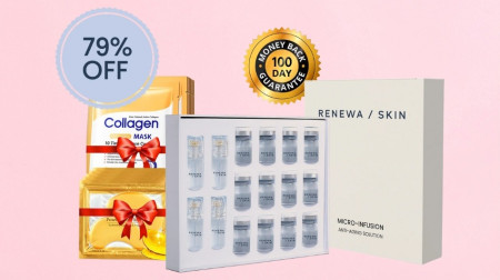 The Renewa Micro-Infusion System is an at-home device that combines microneedling technology with serum delivery. According to the brand's promotional materials, it uses gold-plated microneedles to create tiny channels in the skin at approximately 0.3mm depth, then floods those channels with a proprietary serum before they close.