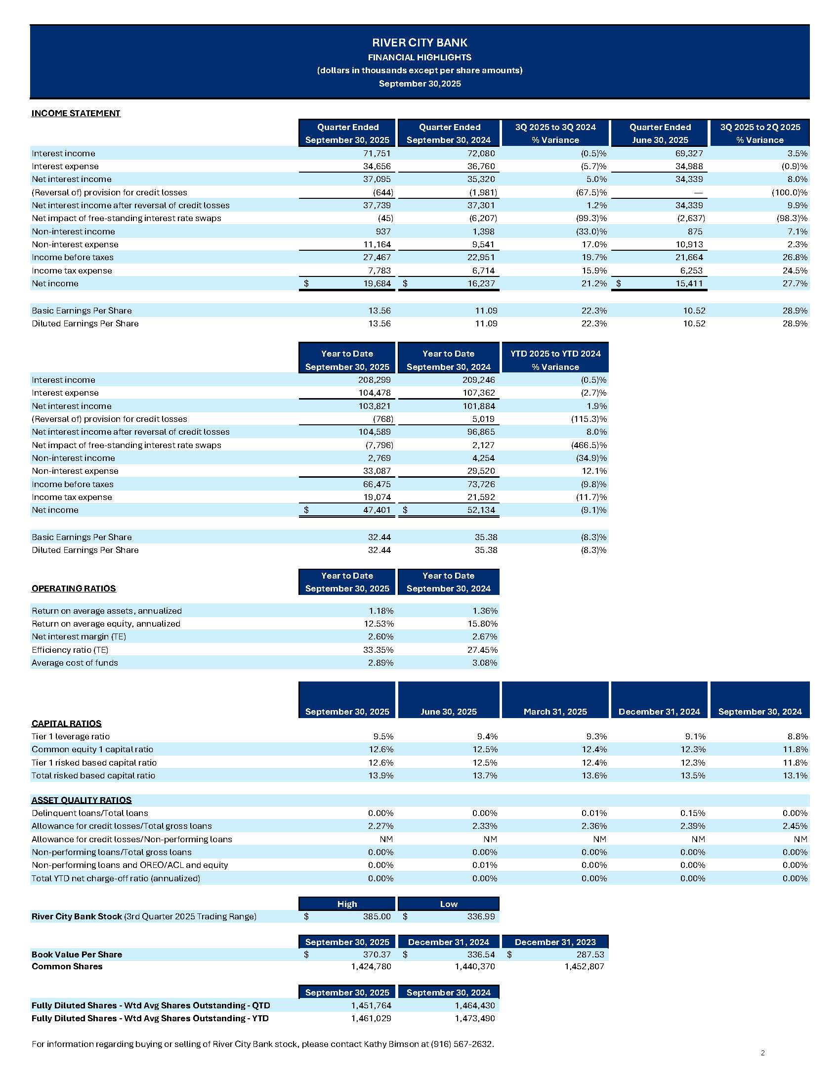 SACRAMENTO, Calif., January 29, 2026 (Newswire.com) - River City Bank ("the Bank") reported net income of $68.4 million or $4.69 per diluted share for the year ended December 31, 2025, which compares to $73.4 million, or $4.99 per diluted share, for the year ended December 31, 2024. The Bank also reported net income of $21.0 million, or $1.45 per diluted share, for the quarter ended December 31, 2025, which compares to $21.3 million, or $1.45 per diluted share, for the same period in 2024. The Bank's earnings for the year ended December 31, 2025 resulted in a 13.31% return on average equity and a 1.25% return on average assets. The Bank's book value per share rose to $38.43 as of December 31, 2025 from $33.65 per share as of December 31, 2024.