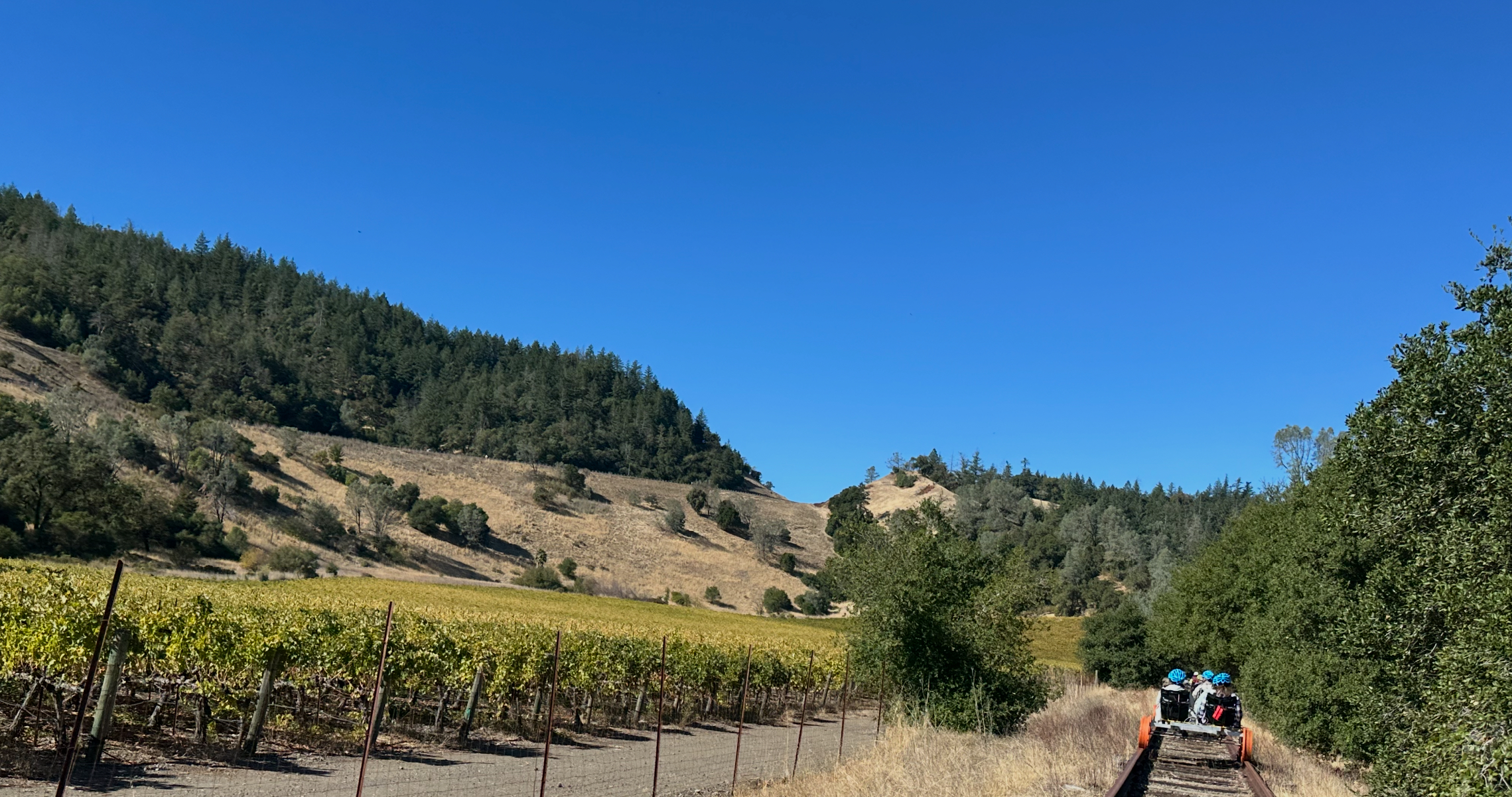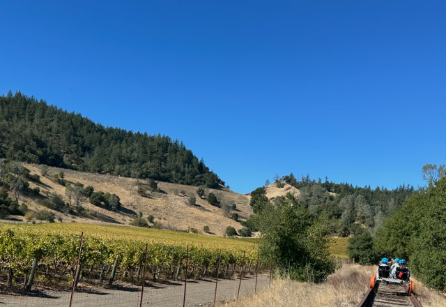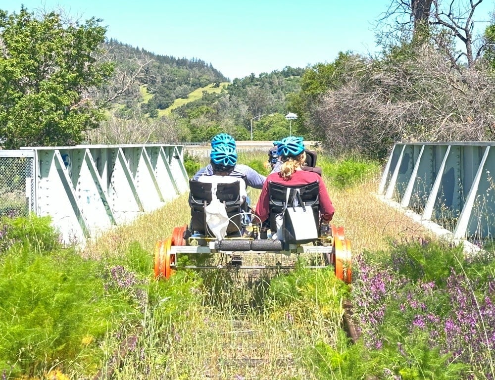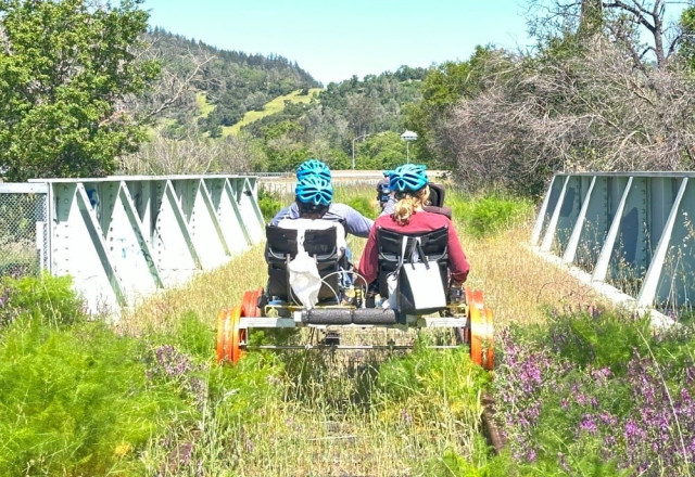 Departing just north of the historic train depot in downtown Cloverdale, the scenic six-mile round-trip route follows the Russian River through forested areas, vineyards, a historic tunnel, and wildlife-rich landscapes. No prior railbike experience is required.