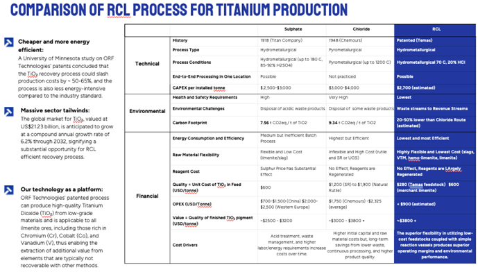 Environmental Performance: The closed-loop design and high reagent recycling rates are core to the RCL platform, irrespective of the target mineral. Over 69% lower operating costs compared to conventional processing due to its core features operating at near ambient temperatures.3 This means the reduced environmental footprint and enhanced ESG profile are benefits that extend to ores and minerals previously noted, not just TiO 2 .