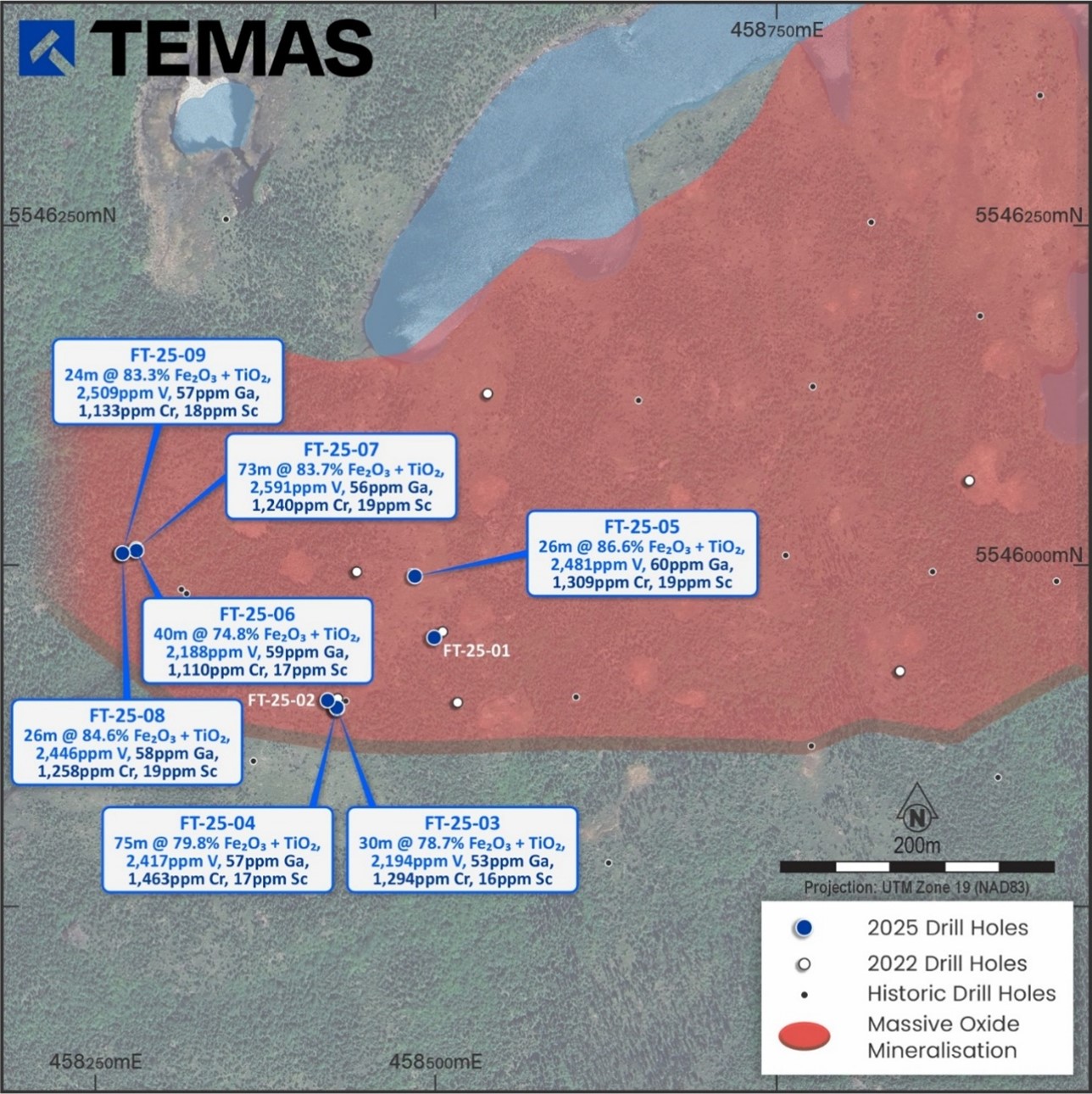 Temas has received assay results for all HQ diamond drill holes completed in November 2025 on the La Blache Project, confirming consistent, high-grade zones of gallium (Ga), scandium (Sc), chromium (Cr), coincident with vanadium (V), titanium (Ti), and iron (Fe) in the massive-oxide (MO) zone