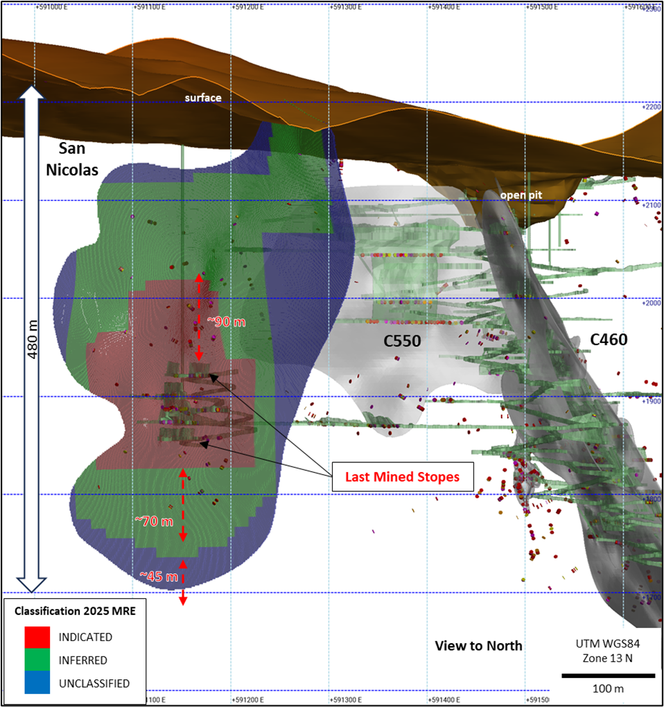 These six holes have extended the San Nicolas mineralization to ~85 m below the bottommost 1874 EL stope. The composited weighted average grade of historical channel samples from the 1874 EL stope returned 279 g/t Ag.Eq over a strike length of 35 m and average width of 1.15 m. By using the classification criteria established in the Technical Report, these holes have the potential to extend the Indicated Resources by additional 70 m at depth over a minimum strike length of 65 m and to extend the Inferred Resources by additional 45 m at depth.