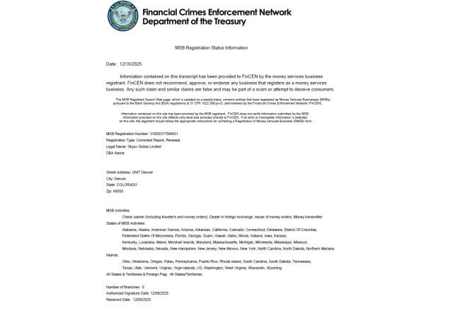 NEW YORK, January 15, 2026 (Newswire.com) - Skysx Global Limited announced the advancement of a compliance-oriented system and risk control architecture upgrade, following its registration as a Money Services Business (MSB) with the U.S. Financial Crimes Enforcement Network (FinCEN). The initiative represents a concrete step in the company's ongoing effort to formalize operational standards and reinforce internal governance across its digital trading services.